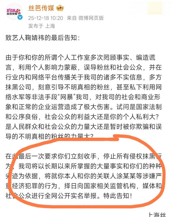12月18日,上海丝芭传媒的公告,字字像冰冷的刀片,将鞠婧祎推到了“涉嫌严重经济违规”的峭壁边。这不仅仅一份公司的声明,更像是一封给通盘娱乐行业的“终末通牒”!