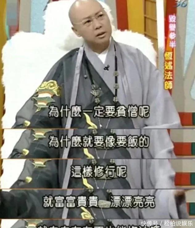 恒述法师度众生的状貌也很绝顶,在电视上常以反差造型劝诱众生:贴胡子的军阀、坦胸露背的歌手、戴假发的帅哥……颠覆传统,具备极大的冲击性。
