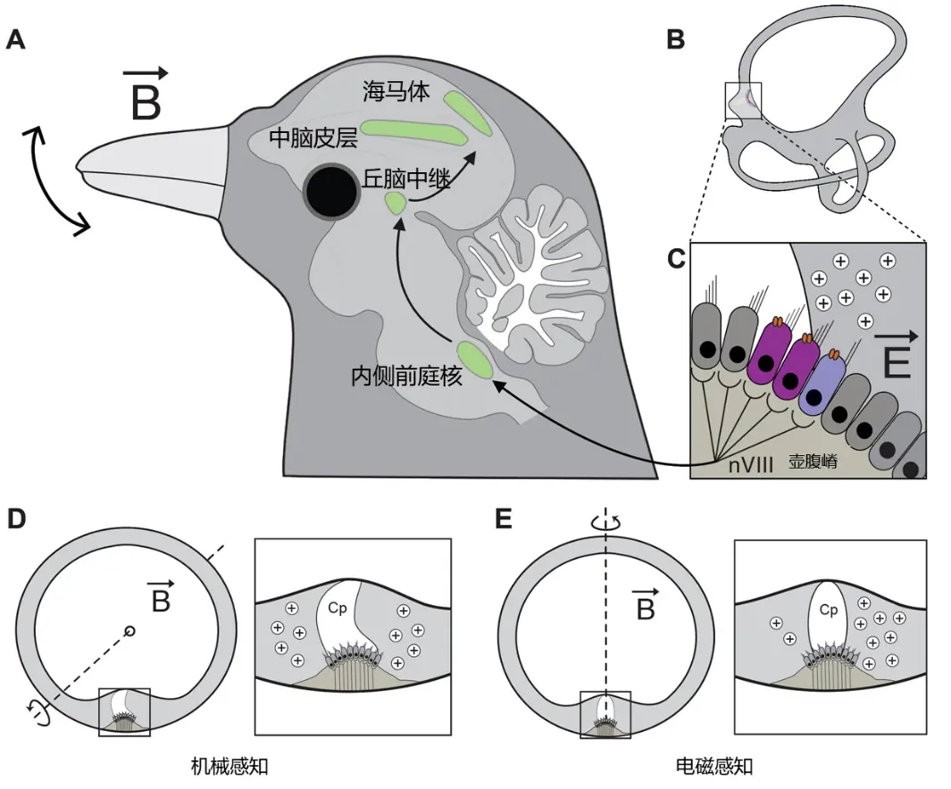 图1 电磁感应驱动的磁感知回路模子。 (A至C) 头部怒放产生的变化磁场在半规管中指挥出电场(E),导致内淋巴液内造成电压梯度(B)。被凝胶状的壶腹帽分离隔的这种电荷互异,由抒发电压明锐性钙通谈CaV1.3和大电导钙激活钾通谈BK的II型毛细胞检测(C)。这一电磁信息从壶腹嵴(ca)经由前庭耳蜗神经(nVIII)传至内侧前庭核(VeM)进行初步措置,随后通过丘脑中继(DTh),与中脑皮层(MC)和海马体(Hp)内的其他嗅觉信息整合。(D) 头部在半规管平面内的旋转通过壶腹帽(Cp)的位移导致毛细胞静纤毛的机械性刺激,不产生电磁感应。(E) 相悖,在存在磁场向量(B)的情况下,头部垂直于半规管平面的旋转会导致电荷在壶腹帽两侧从头散布,而毛细胞不发盼愿械位移。因此,鸟类大略远离机械性输入和电磁性输入