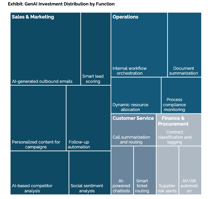 当今大部分投资(高达AI预算的50%到70%)皆流向了对外可见的一线业务,比如销售和阛阓营销联系的试点方式。